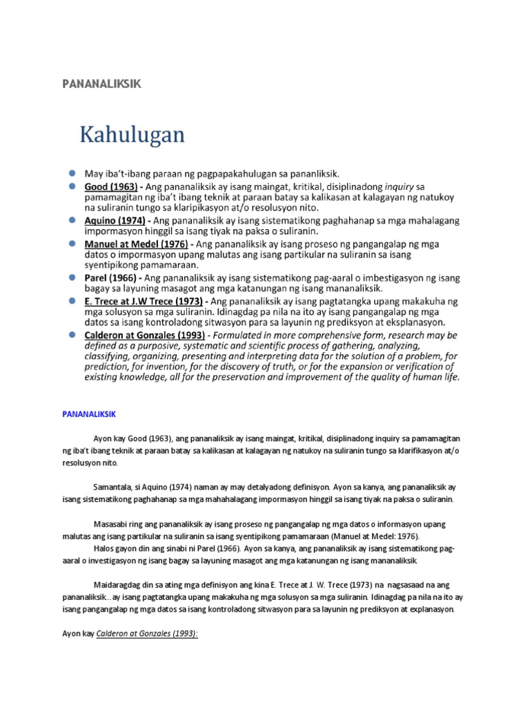 Ano ba ang paksang inaaralan at Bakit ito pinag-aaralan. Ito ay isang maingat kritikal disiplinadong inquiry sa pamamagitan ng ibat ibang teknik at paraan batay sa kalikasan at kalagayan ng natukoy na suliranin tungo sa klarifikasyon at o resolusyon nito. Samantala si Aquino 1974 naman ay may detalyadong definisyon.