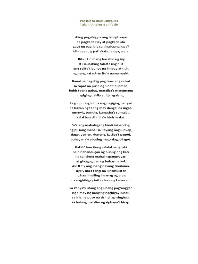 Posted on January 15 2013 by derpokim. Banal na pag-ibig pag ikaw ang nukal. PAG-IBIG SA TINUBUANG LUPA ni Andres Bonifacio Madaram sa tulang ito ang mapusok na diwa ng Ama ng Katipunan Aling pag-ibig pa ang hihigit kaya sa pagkadalisay at magkadakila Gaya ng pag-ibig sa sariling lupa.